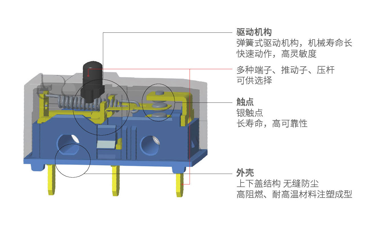 请根据额定值电流、操作负载、驱动杆的种类、使用温度等要求选择合适型号的开关;