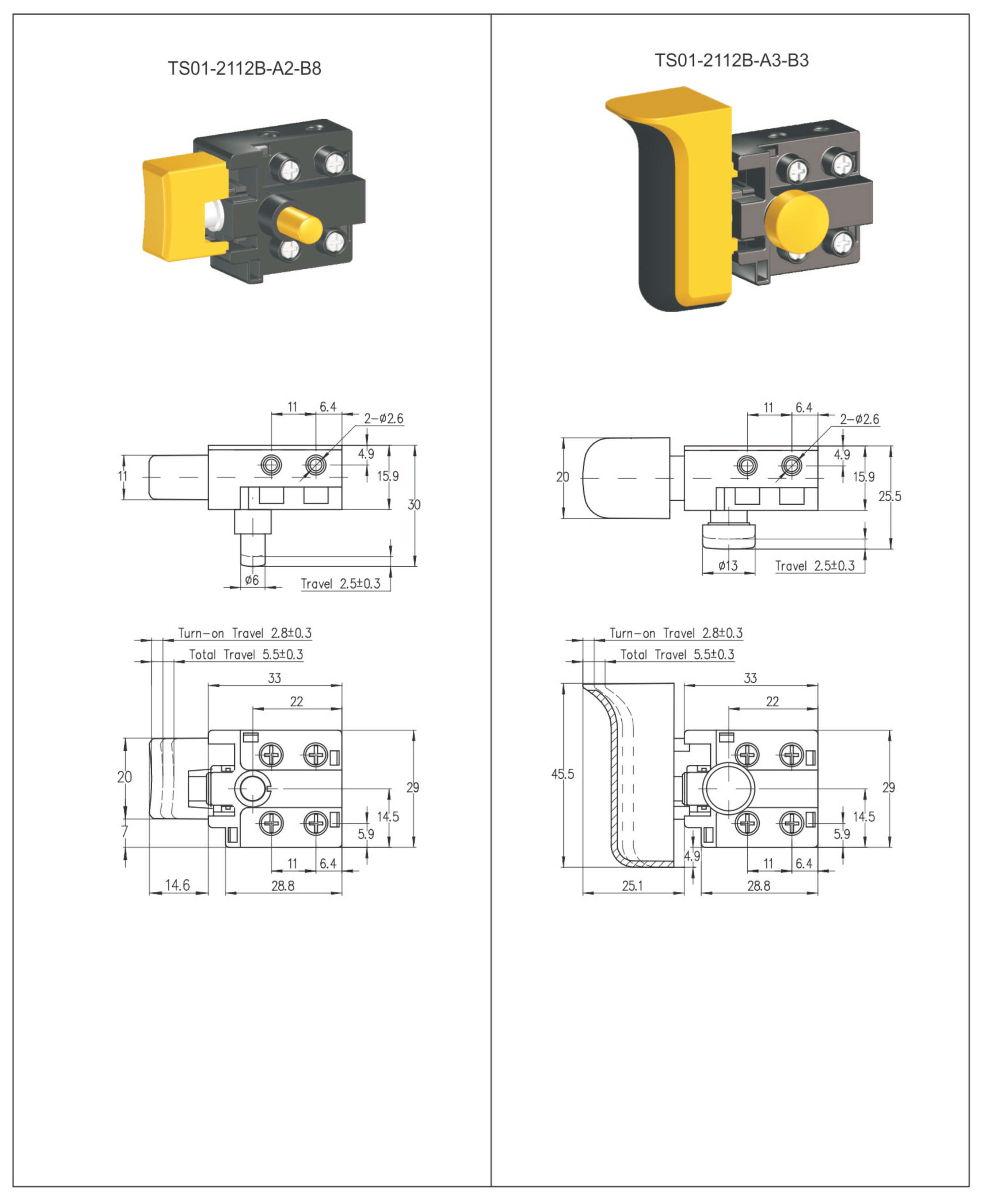 ◆ TS01 series are general type trigger switch, integrated dustproof, commonly for used in portable power tools such as: Electric Drills, Rotary Hammers, Reciprocating Saws,Jig Saws, Electric Mixers, Cut-Off Machines, Marble Cutters, Electric Routers, Circular Saws, Belt Sanders, Orbit Sanders, Polishers, Electric Planers, Electric Sprayers, Electric Nailers, etc. Besides, they are also suitable for power gardening tools, such as: Grass Trimmers, Electric Chain Saws, Electric Lawnmowers, Electric Snowthrowers, etc.