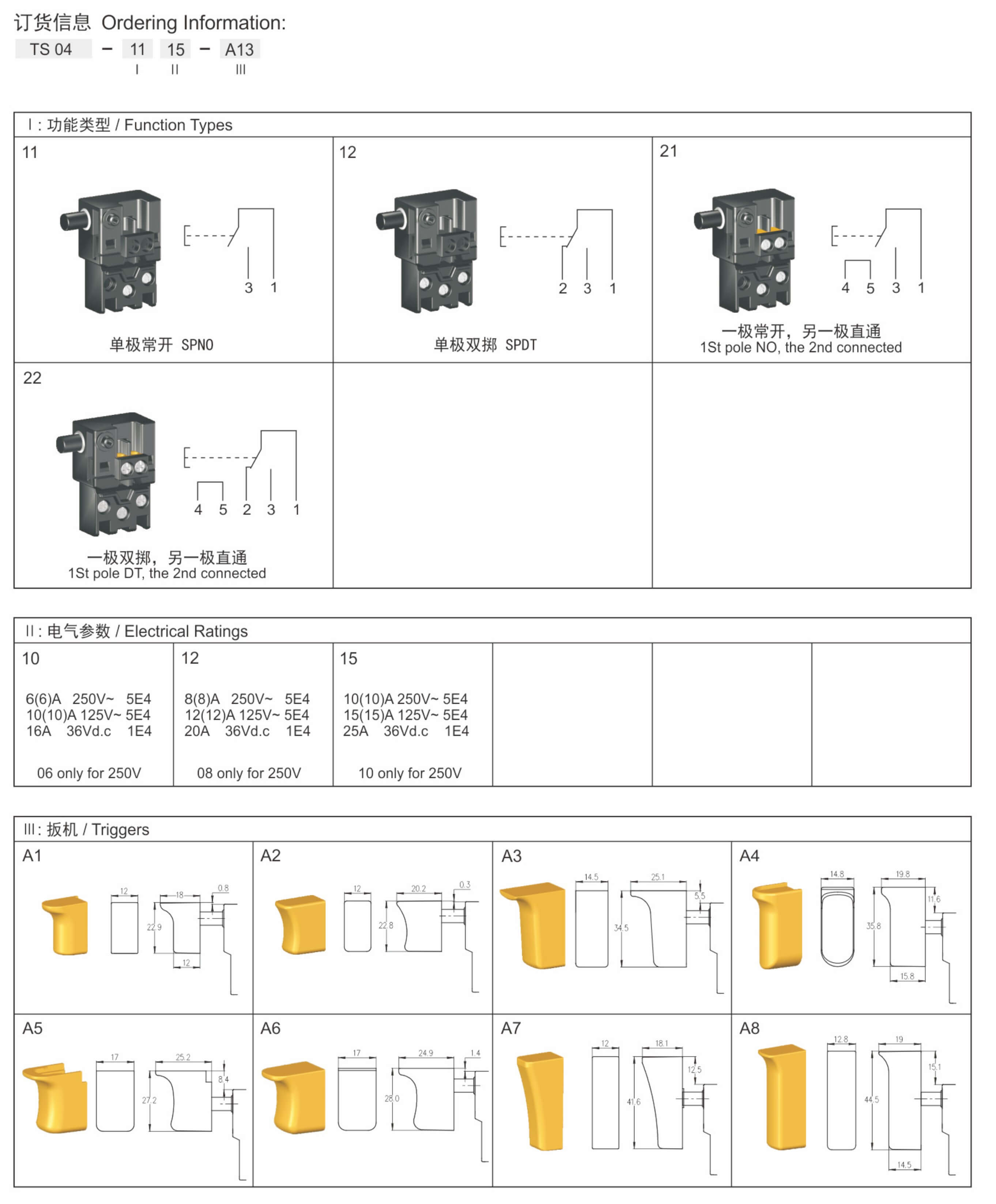 ◆ TS04 series are onegeneral type trigger switch, integrated dustproof, commonly for used in powertools such as: Cut-off Machines, Miter Saws, Circular Saws, Electric Hammers, etc.
