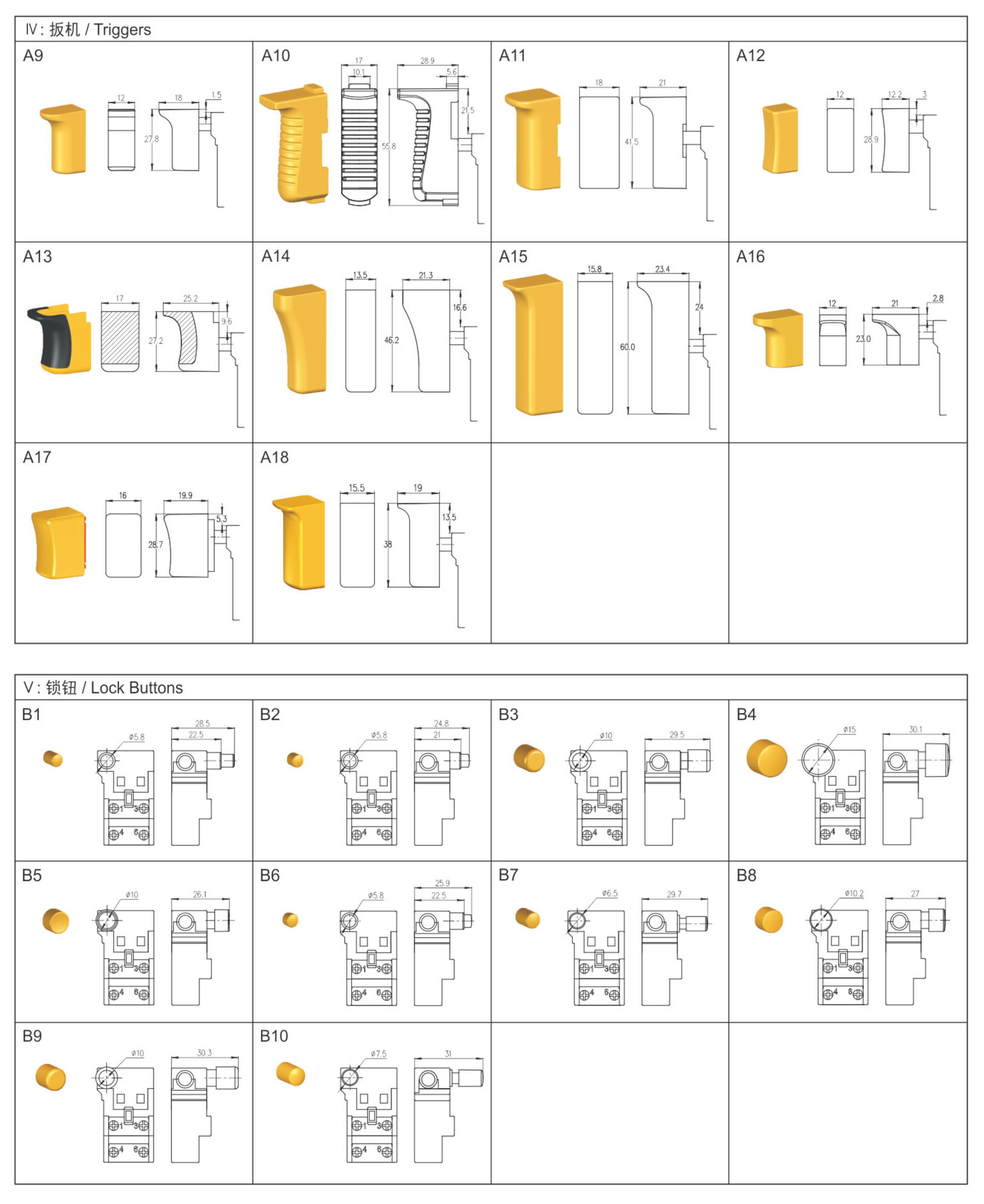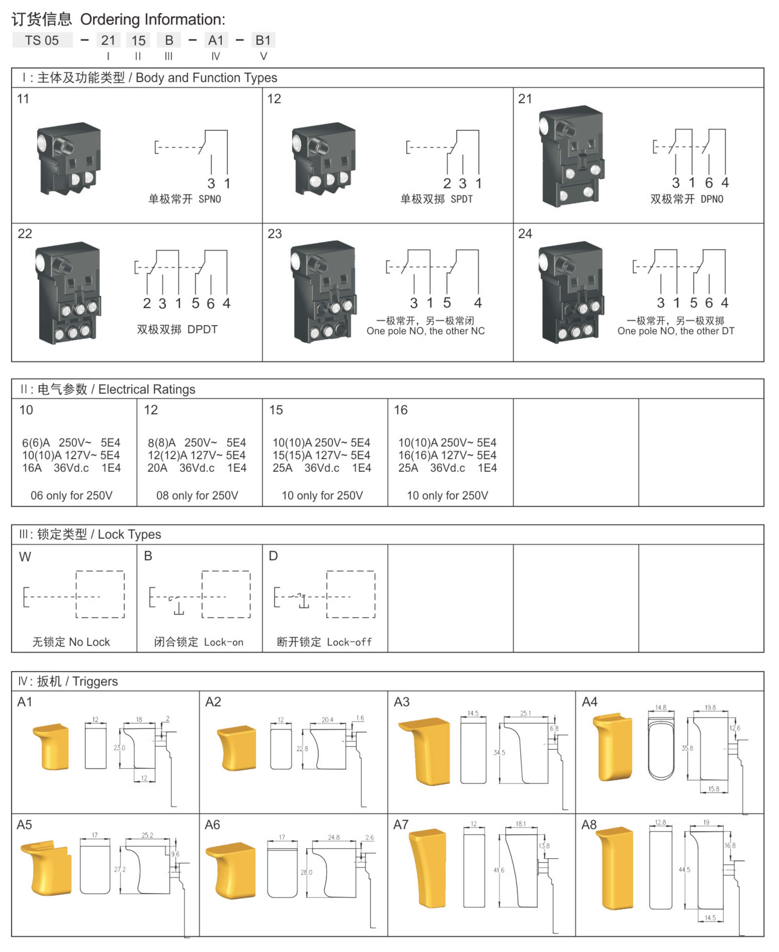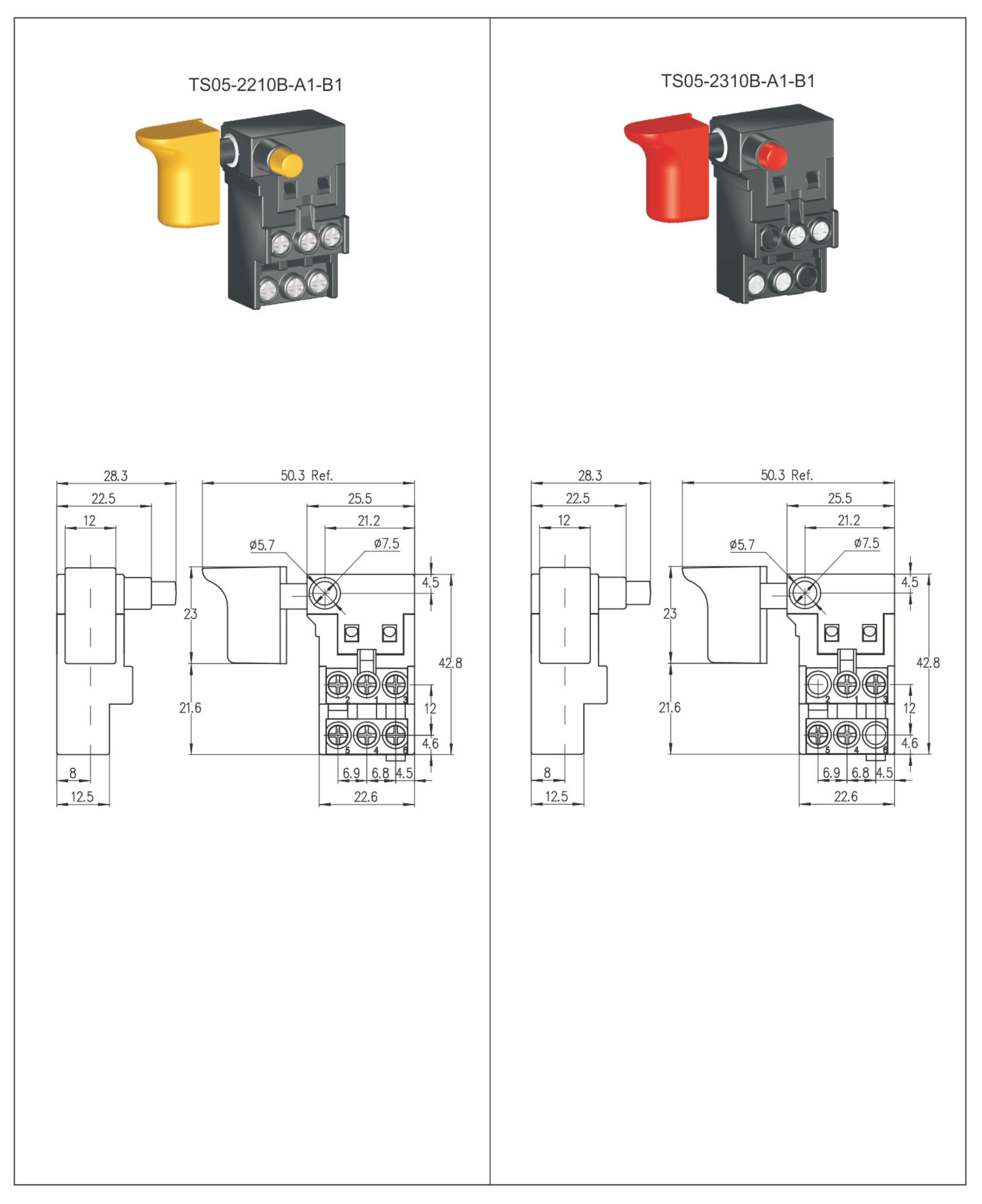 ◆ TS05 series are onegeneral type trigger switch, integrated dustproof, commonly for used in portable power tools such as: Cut-off Machines, Miter Saws, Marble Cutters, Circular Saws, Electric Hammers, Electric Routers, Belt Sanders, Electric Planers, etc.
