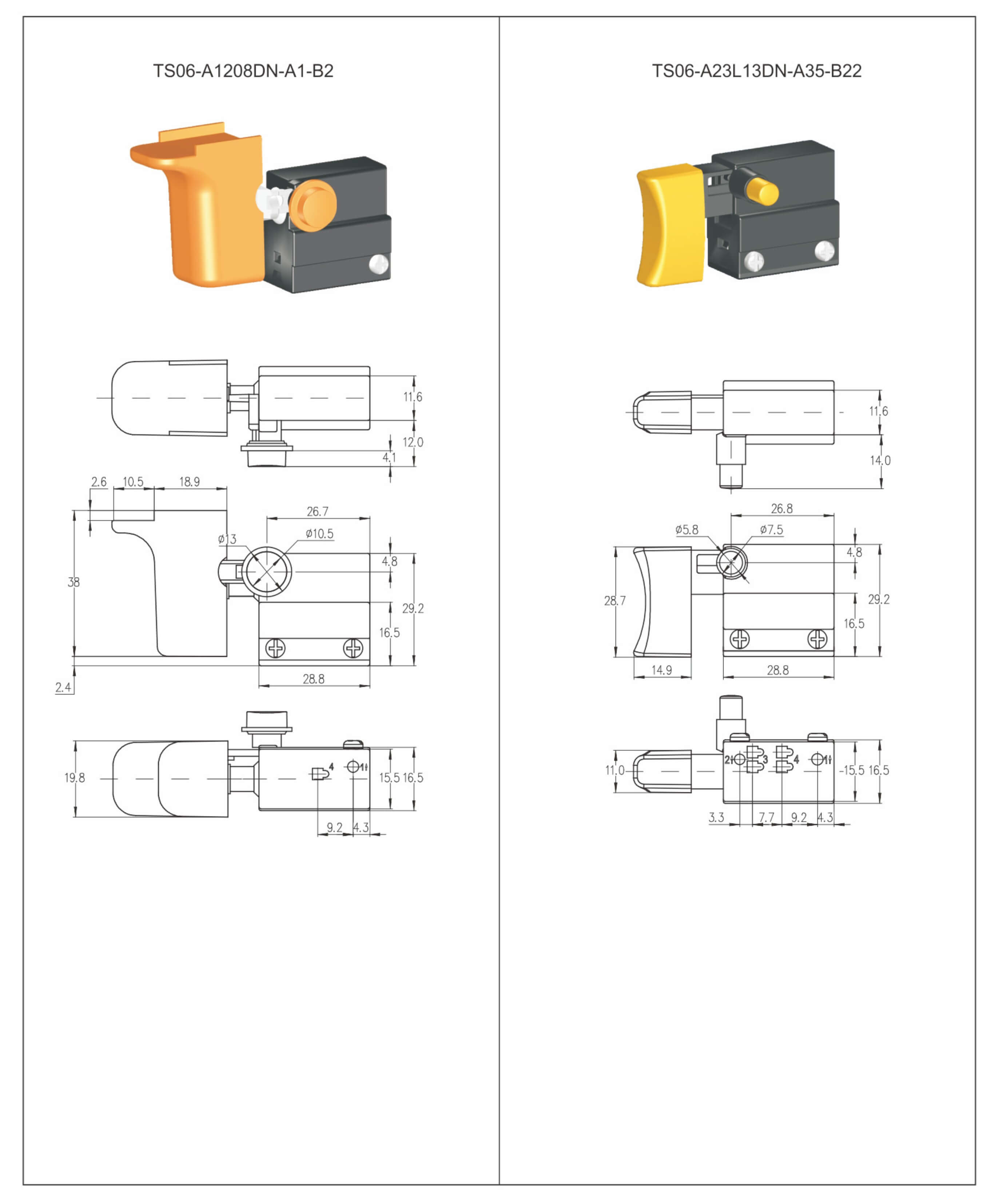 ◆ TS06 series are one general type trigger switch, optional integrated dustproof version, commonly for used in power tools such as: Marble Cutters, Circular Saws, Electric Hammers, Electric Routers, Belt Sanders, Belt Saws, Electric Planers, Electric Mixers, Electric Sprayers, etc.