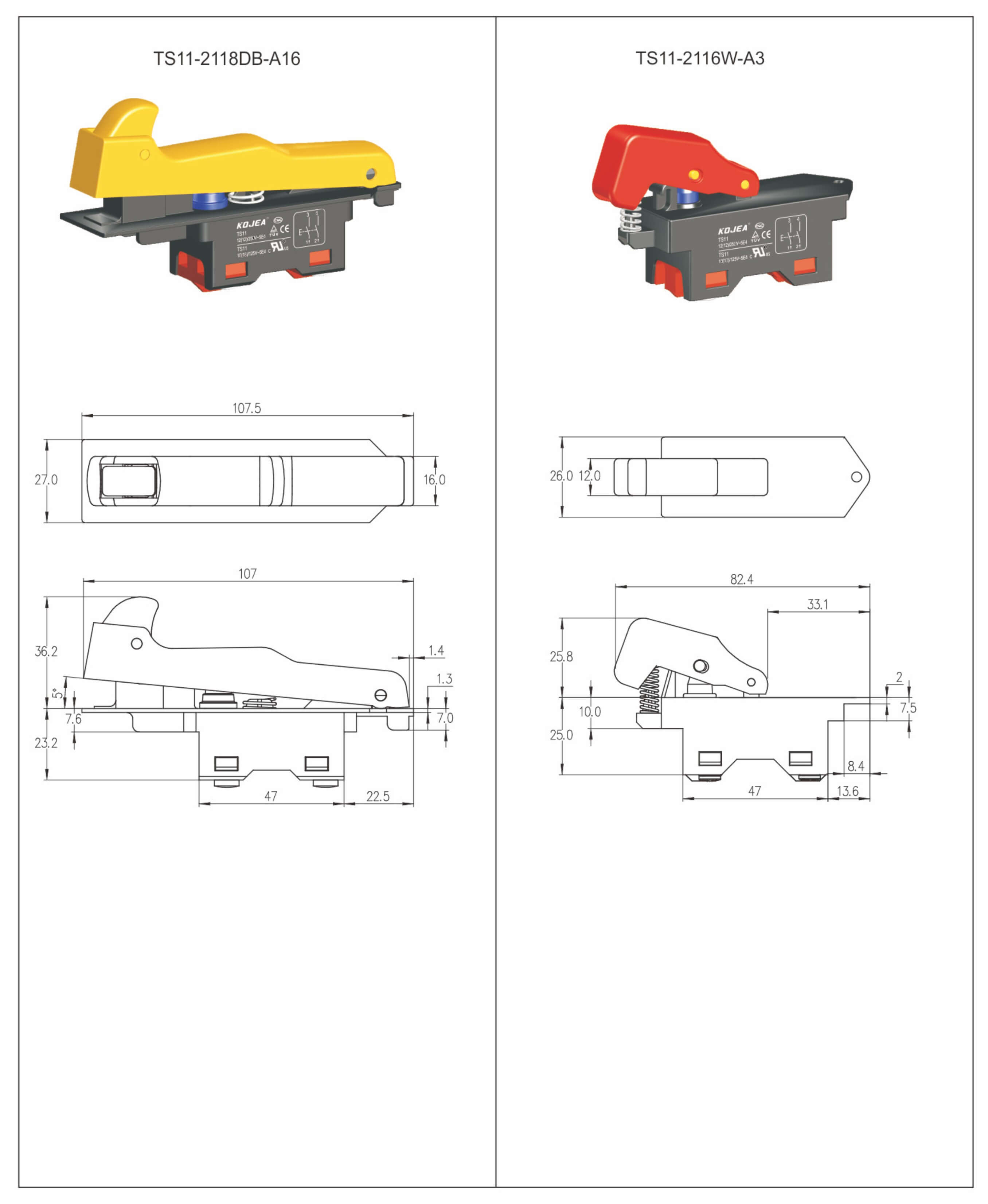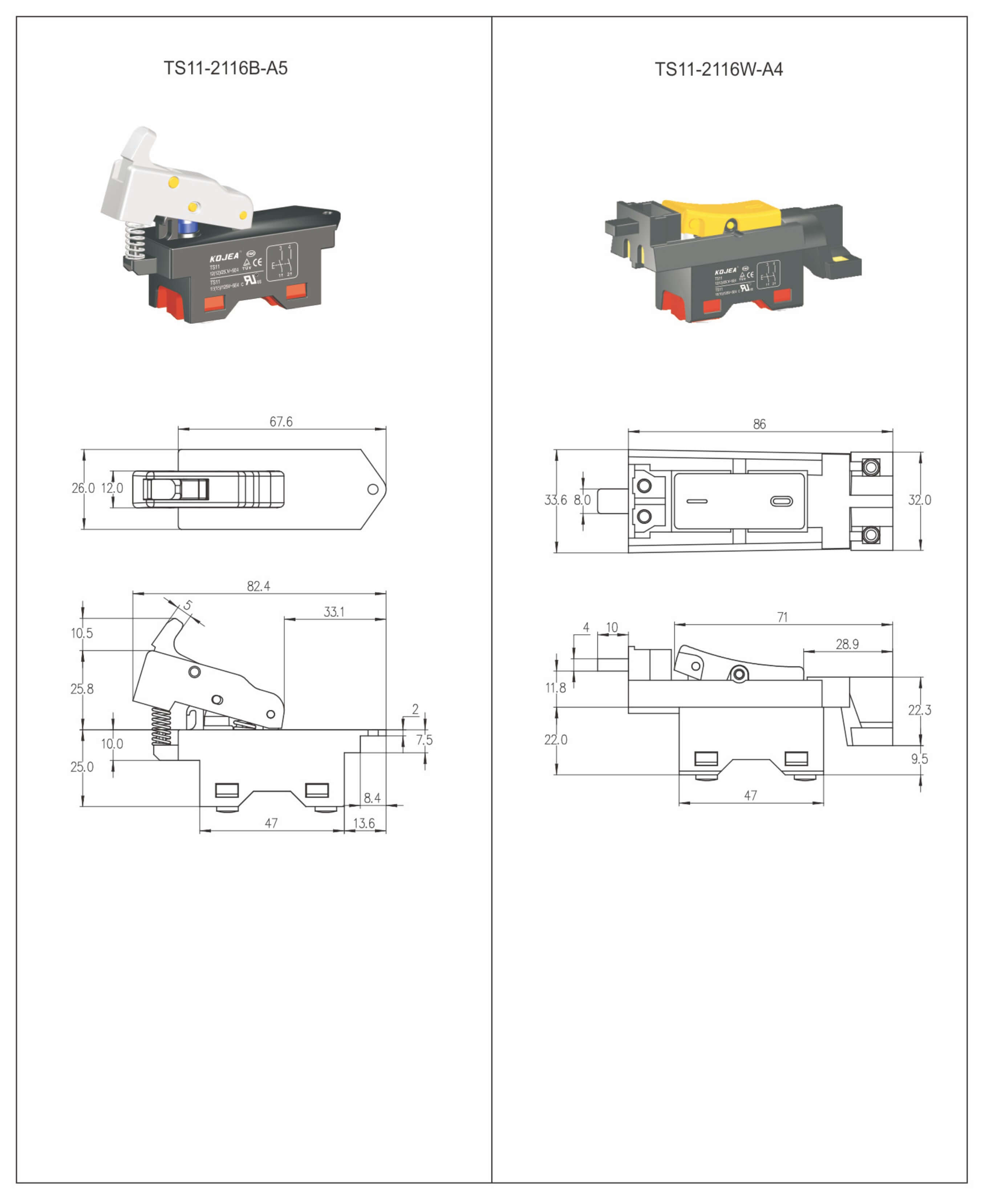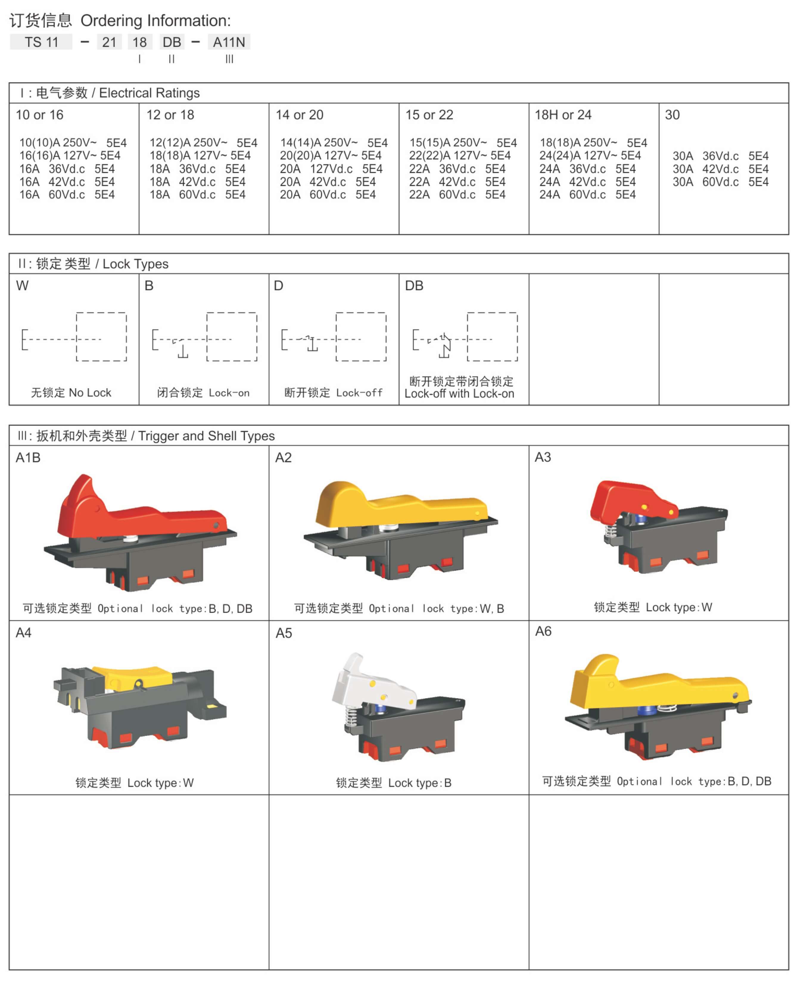 ◆ TS11 series are one general type high rated trigger switch, integrated dustproof, withsnap-action structure, for used in high rated power-tools such as: Cut-off Machines, Miter Saws, 180mm and 230mm Angle Grinders, Heavy Rotary Hammers, Heavy Demolition Hammers, etc. The body and trigger accept customize according to customer's request.