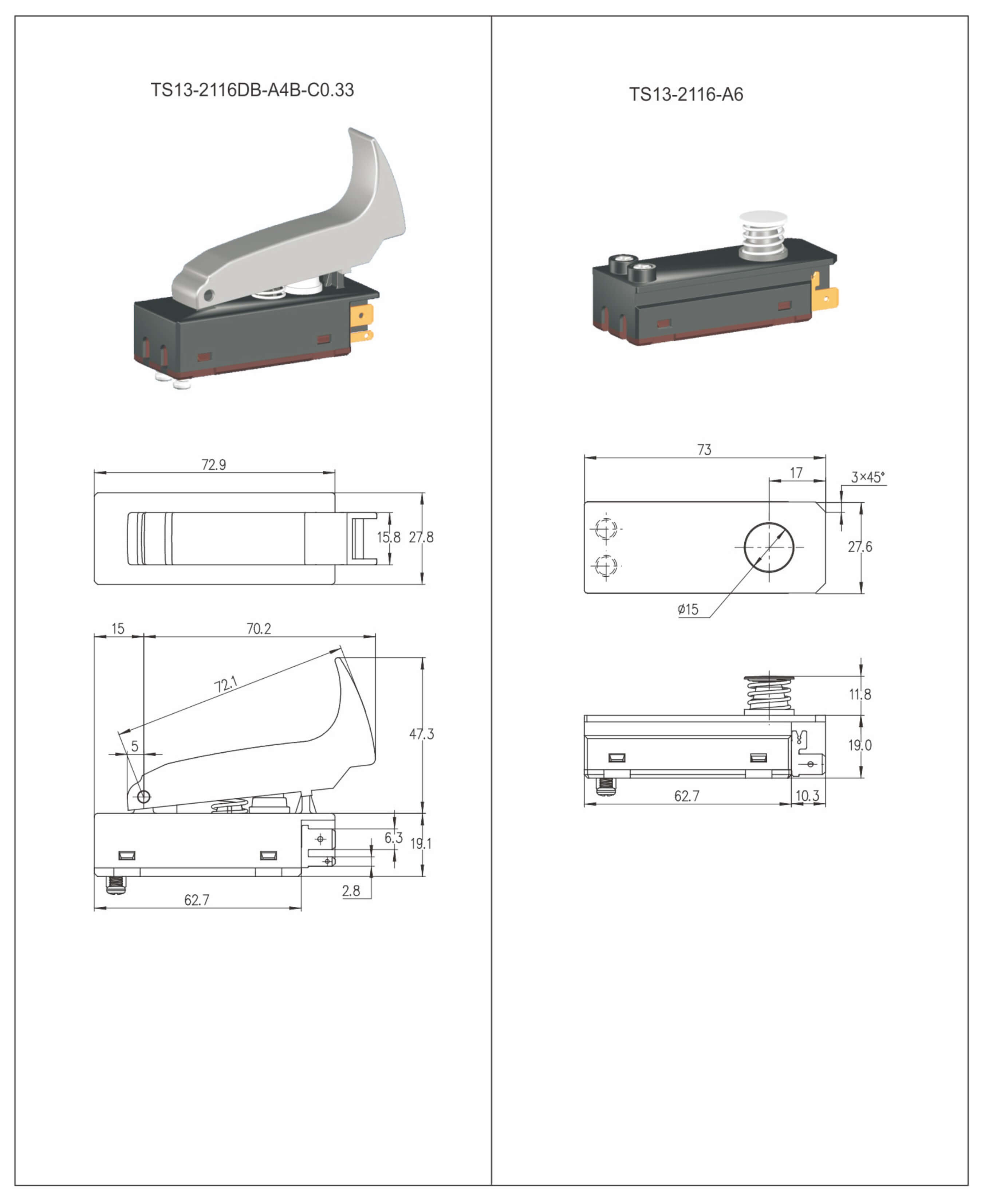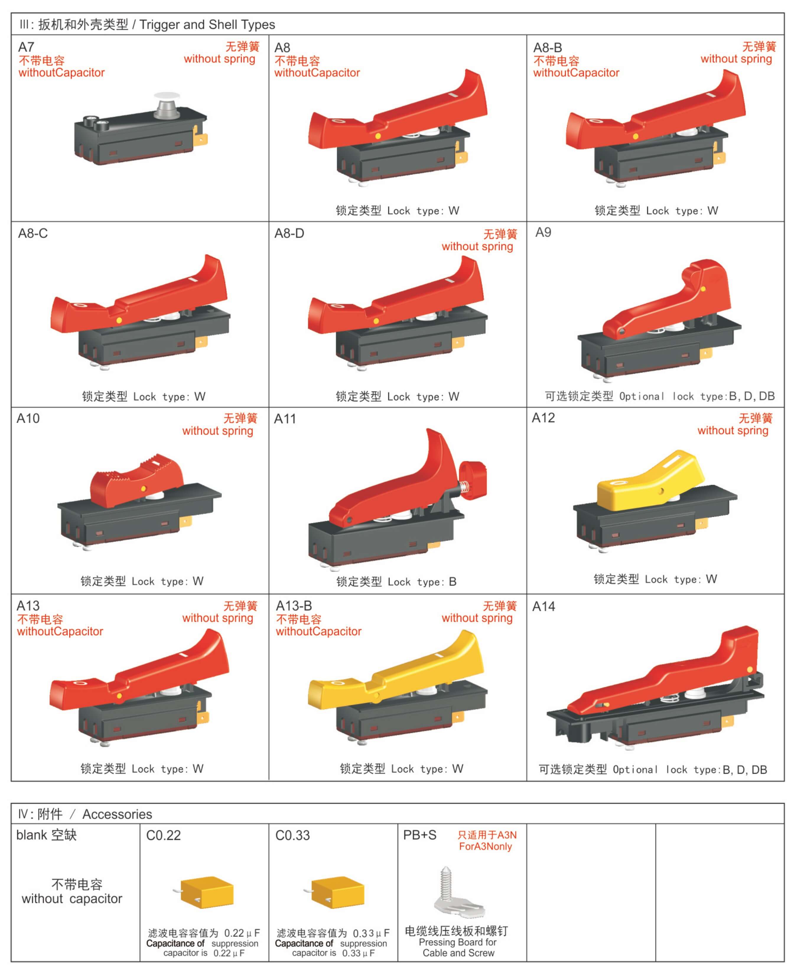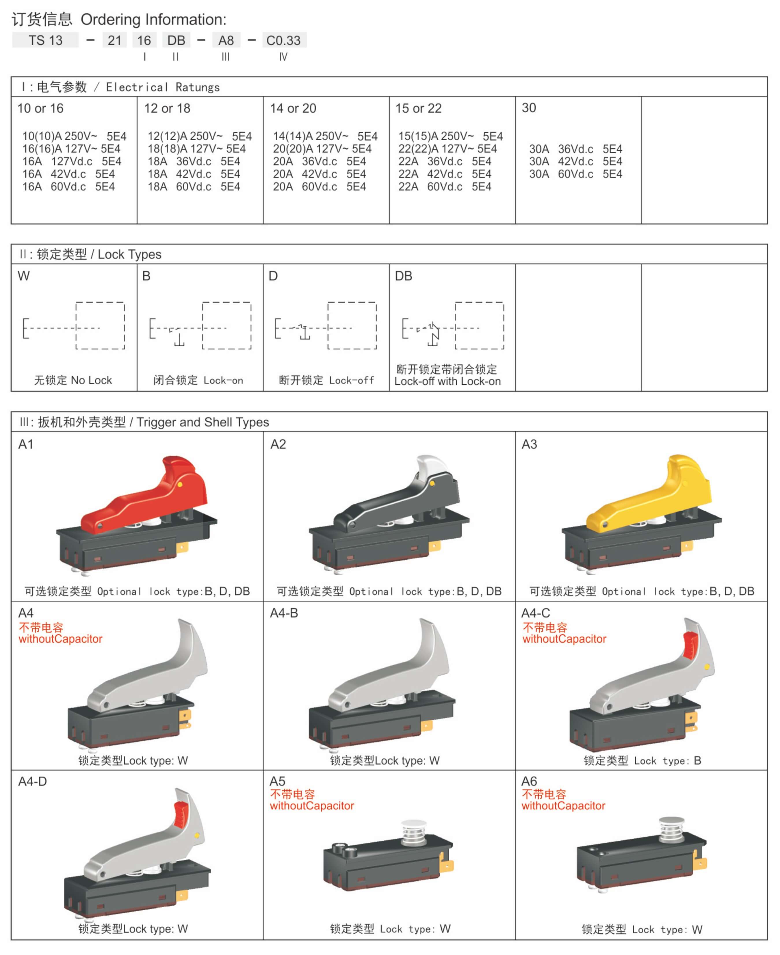 ◆ TS13 series are special type high rated trigger switch, integrated dustproof, withsnap-action structure, for used in high rated power-tools such as: Cut-off Machines, Miter Saws, 180mm and 230mm Angle Grinders, Rotary Hammers, Demolition Hammers, etc. These switch has more than 10 body and trigger types for customer's choice, also accept customize according to customer's request.