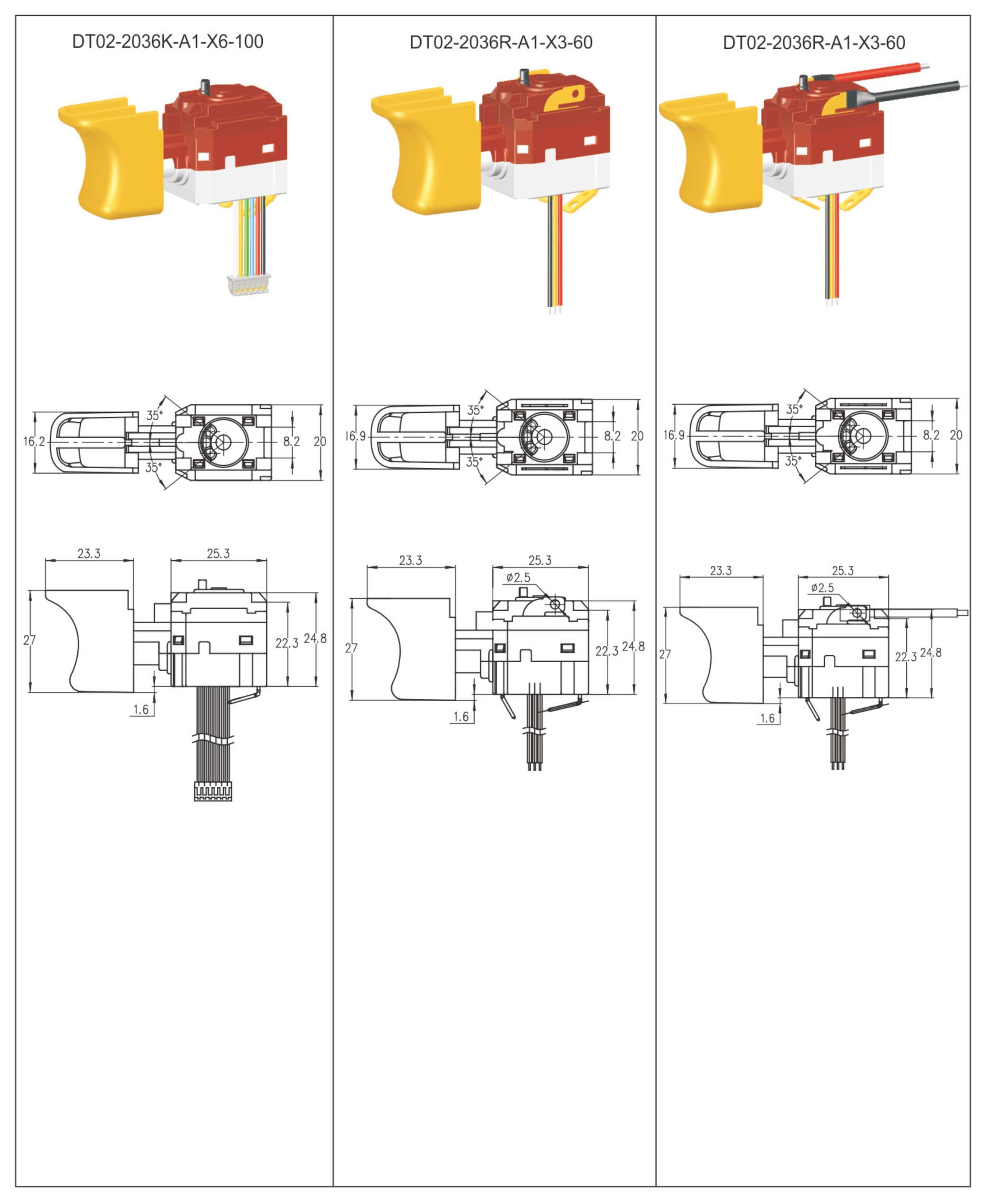 ◆ DT02 series areone special type DC trigger switches integrated dustproof and mechanical brake contact, optional with inner reversing structure, commonly for used in DC cordless portable power-tools and power gardening tools such as: Cordless Drills, Cordless Screw Drivers, Cordless Rotary Hammers, Cordless Impact Wrenches, Cordless Grass Trimmers, Cordless Blowers etc. Besides, they also suitable for brushless DC tools.
