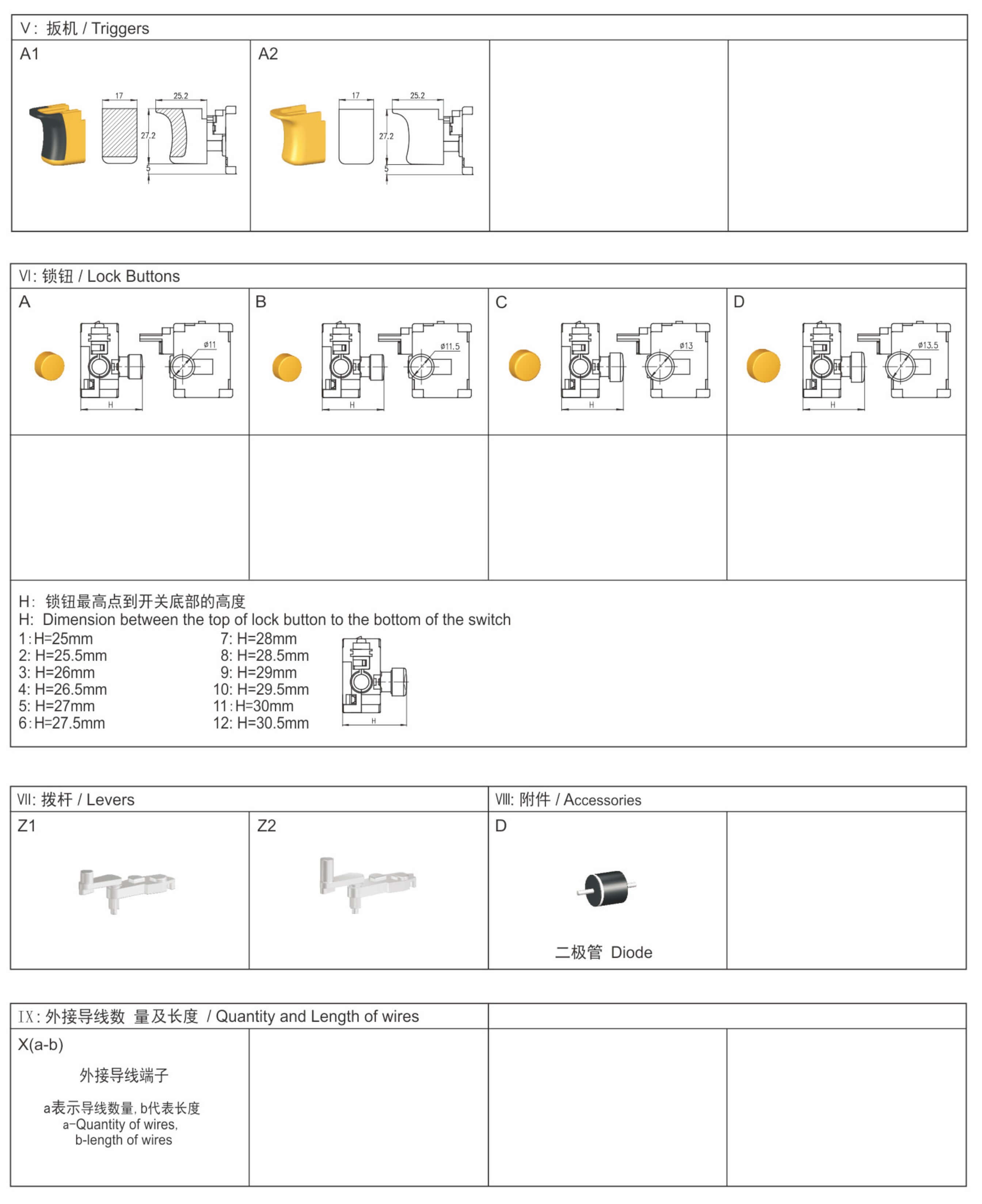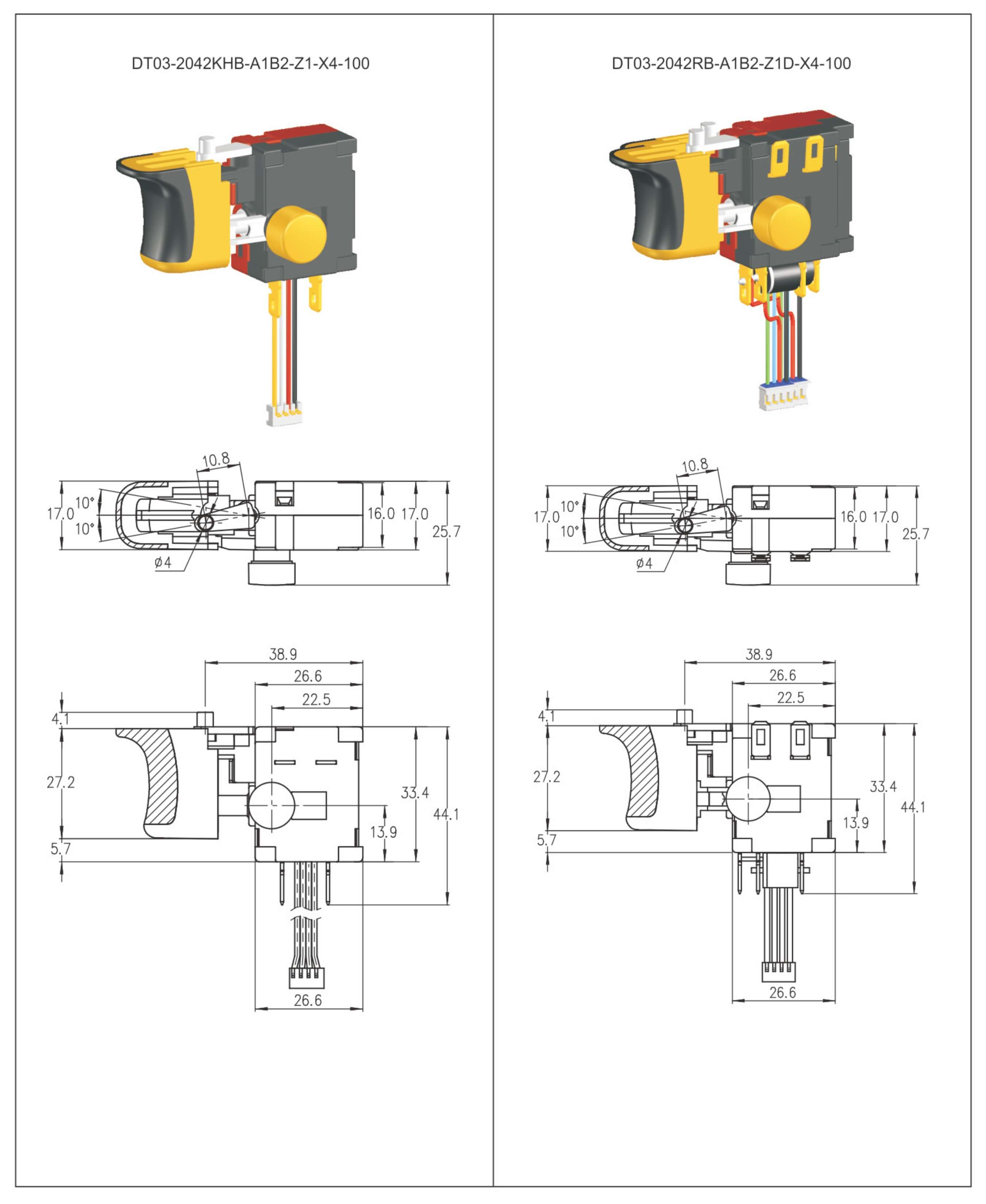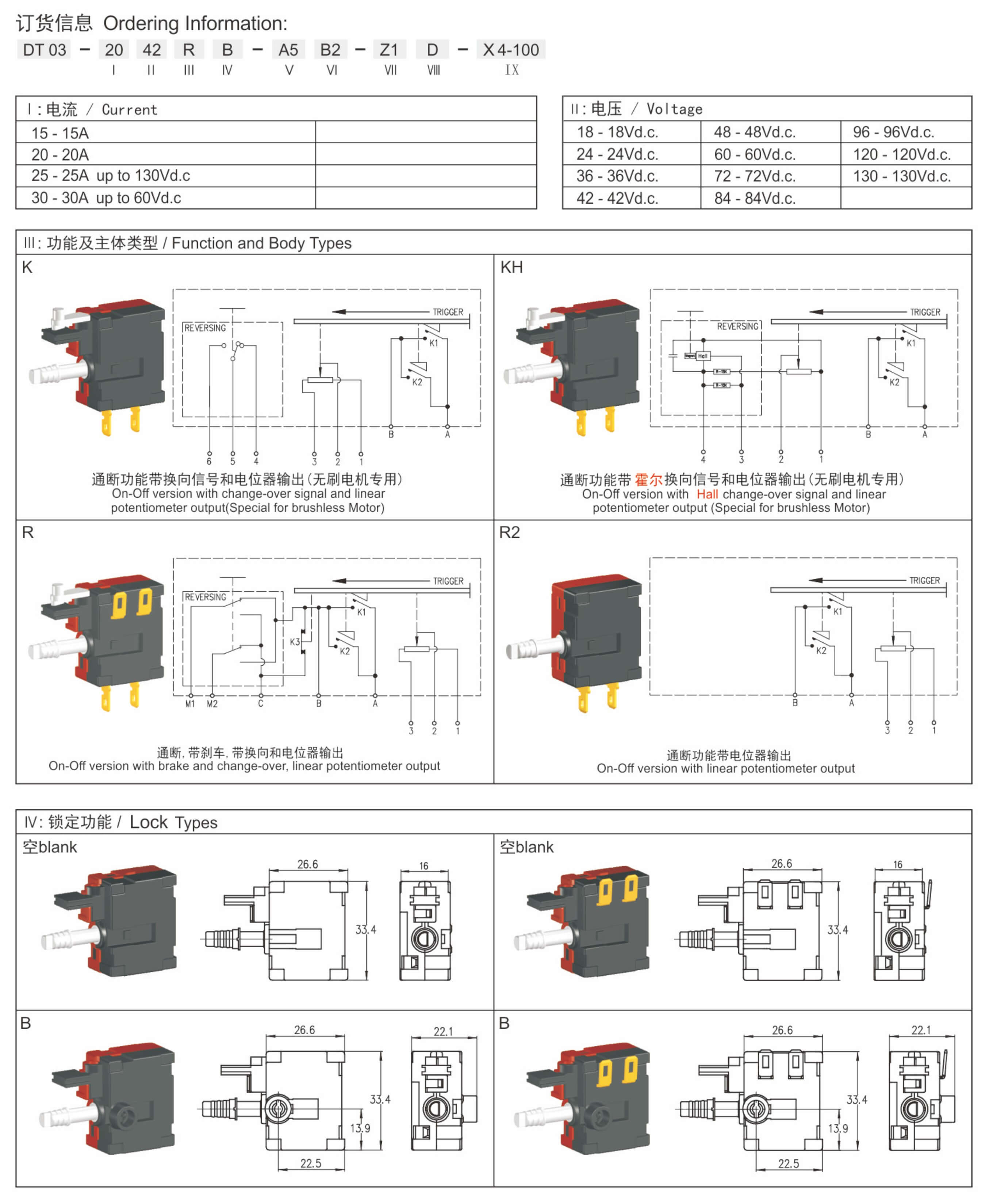 ◆ DT03 series areone special type DC trigger switches integrated dustproof and mechanical brake contact, and reversing box, commonly for used in DC cordless portable power-tools such as: Cordless Drills, Cordless Screw Drivers, Cordless Rotary Hammers, Cordless Impact Wrenches, etc. Besides, they also suitable for brushless DC tools.