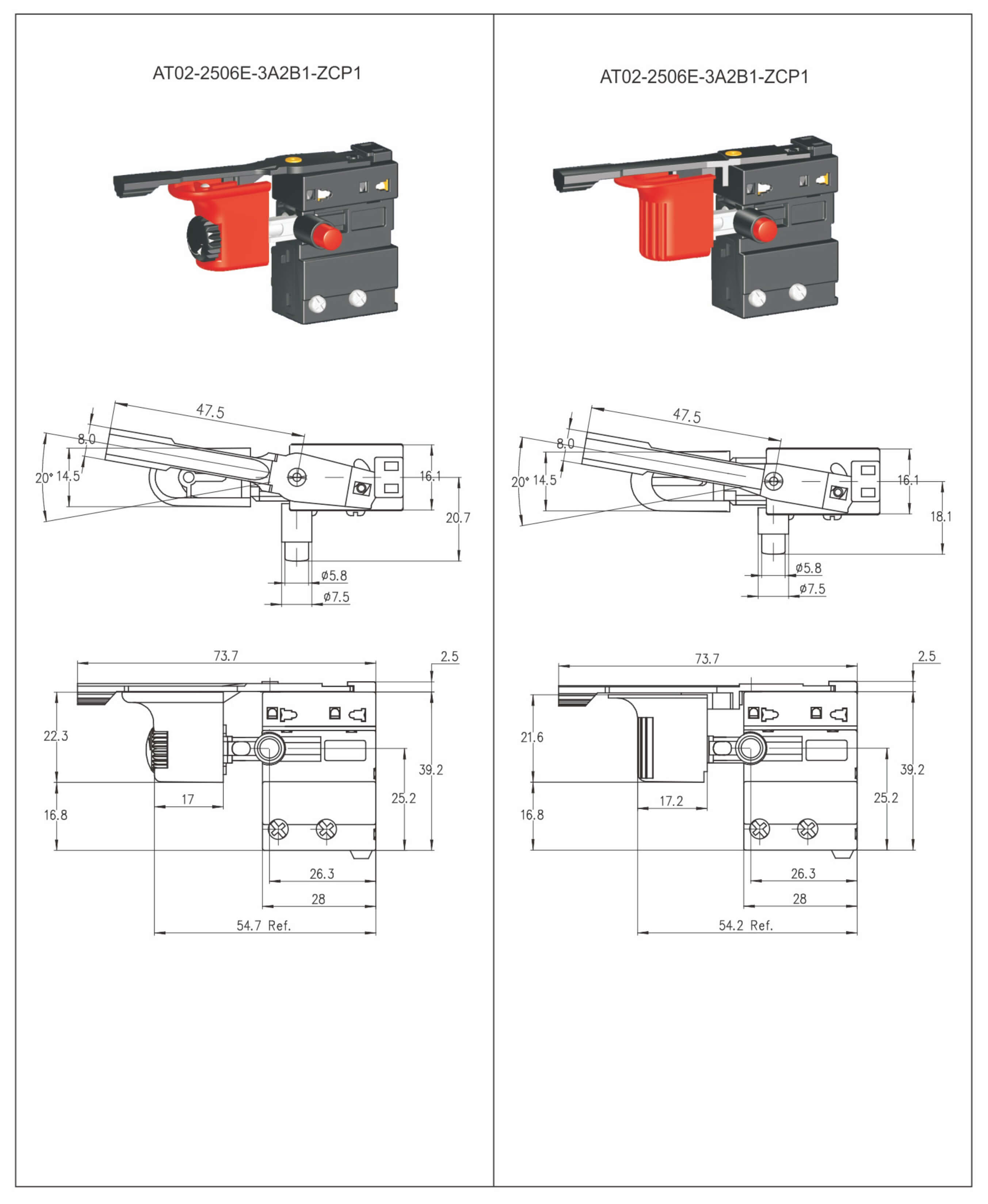 ◆ AT02 系列是一款通用型扳机电子调速开关,其中集成防尘功能,广泛应用于各类电动工具,如:6mm电钻,10mm电钻,冲击钻,冲击螺丝起子,电锤,曲线锯,搅拌器,平板砂光机等,也可用于吊磨机的脚踏开关等.开关有多种扳机,锁钮和拨杆可以选择,也可以根据客户要求进行定制.