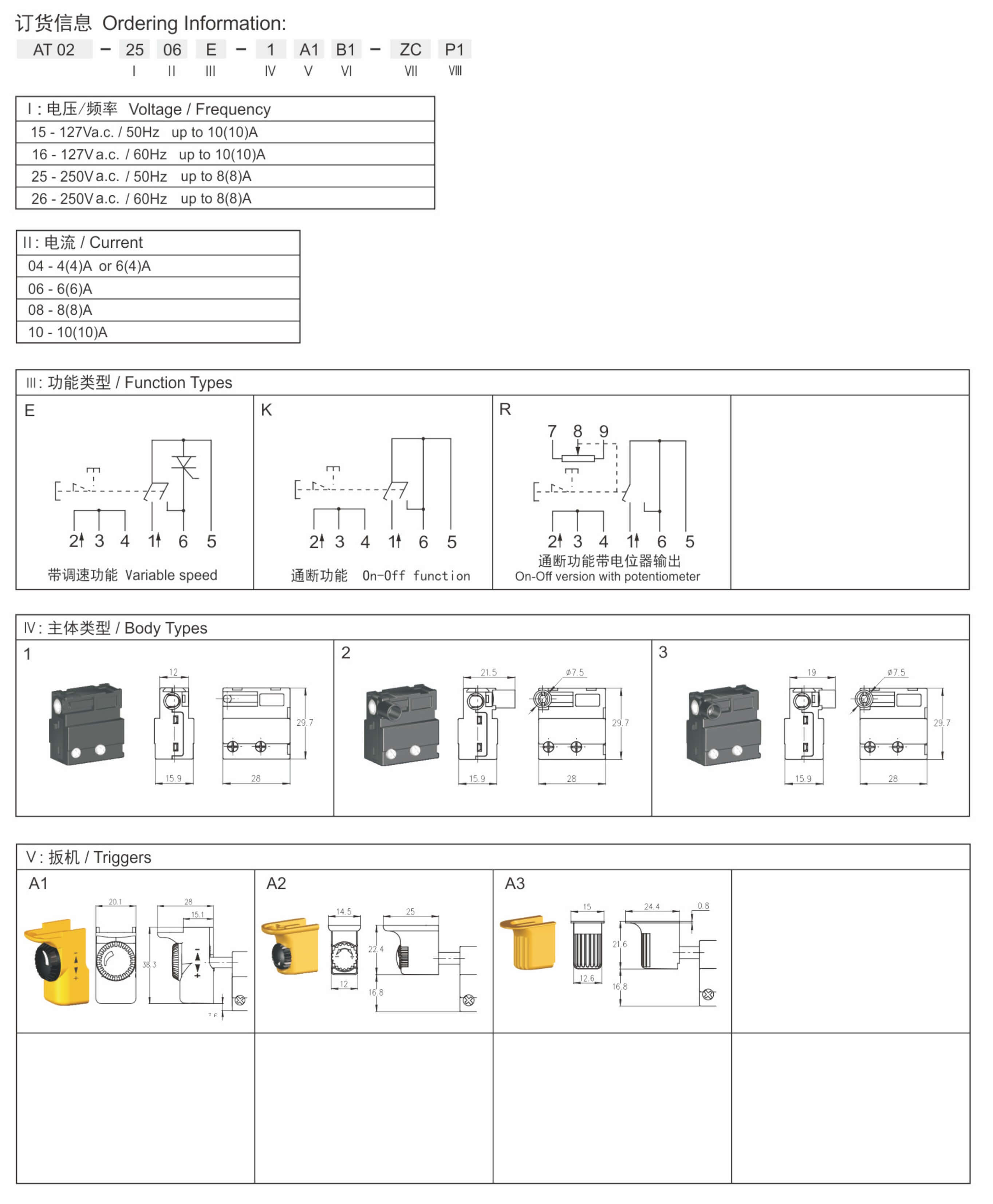 ◆ AT02 series are general type multi-speed trigger switches with by-passcontact, integrated dustproof, for popular used in portable power-tools such as: 6mm Drills, 10mm Drills, Impact Drills, Impact Screw Drivers, Rotary Hammers, Jig Saws, Electric Mixers, Orbit Sanders, etc. Also used for Foot switch of Hanging Carving Machine.